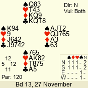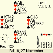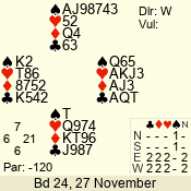 Con | Dc | Res | Score | Ld | Pairs | Rd | Tbl | 1 NT | E | +1 | -120 | 7 | 06 - 03 | 4 | 6 |
