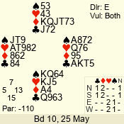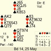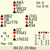 | Con | Dc | Res | Score | Ld | Pairs | Rd | Tbl | | 3 N | E | -4 | 400 | 2 | 05 - 04 | 2 | 5 |