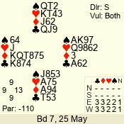 | Con | Dc | Res | Score | Ld | Pairs | Rd | Tbl | | 3 N | N | -1 | -50 | 7 | 05 - 06 | 6 | 5 |
