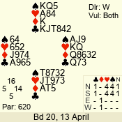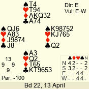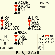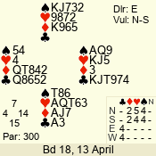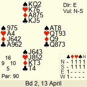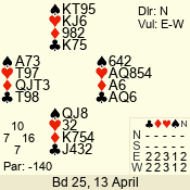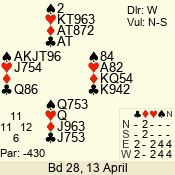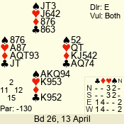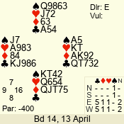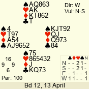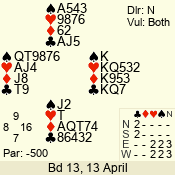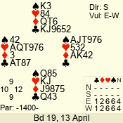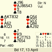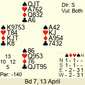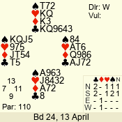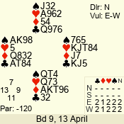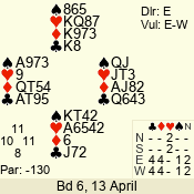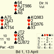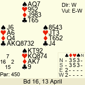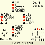 | Con | Dc | Res | Score | Ld | Pairs | Rd | Tbl | | 1 NT | N | = | 90 | 4 | 04 - 07 | 6 | 4 |