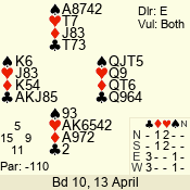 | Con | Dc | Res | Score | Ld | Pairs | Rd | Tbl | | 1 NT | E | -2 | 200 | 6 | 10 - 06 | 7 | 3 |