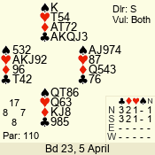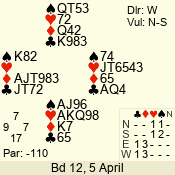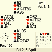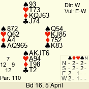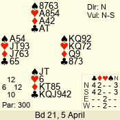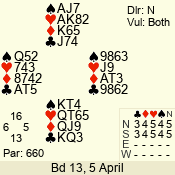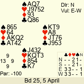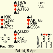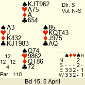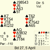 | 3 NT | W | +1 | -630 | 2 | 08 - 12 | 1 | 2 |
