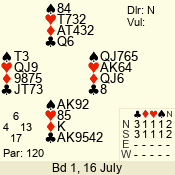Con | Dc | Res | Score | Ld | Pairs | Rd | Tbl | 1 NT | S | +1 | 120 | 3 | 06 - 05 | 2 | 6 |