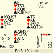 | Con | Dc | Res | Score | Ld | Pairs | Rd | Tbl | | 2 N | S | = | 120 | 4 | 03 - 01 | 3 | 3 |