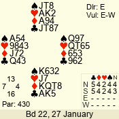 Con | Dc | Res | Score | Ld | Pairs | Rd | Tbl | 3 NT | N | +1 | 430 | 5 | 01 - 02 | 6 | 1 |