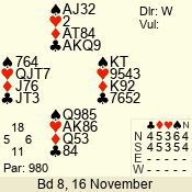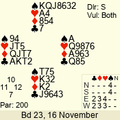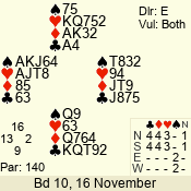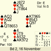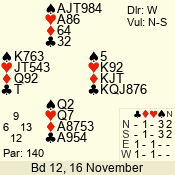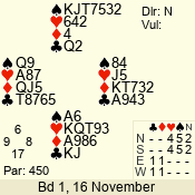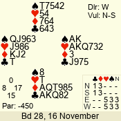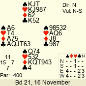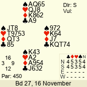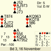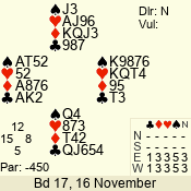 | Con | Dc | Res | Score | Ld | Pairs | Rd | Tbl | | 3 N | S | +2 | 460 | 2 | 05 - 03 | 3 | 5 |