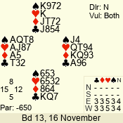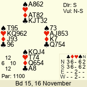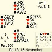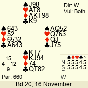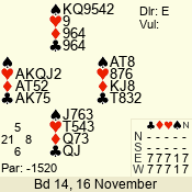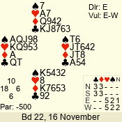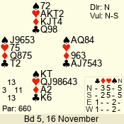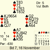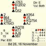 | Con | Dc | Res | Score | Ld | Pairs | Rd | Tbl | | 3 N | N | +1 | 630 | 3 | 05 - 05 | 1 | 5 |
