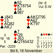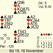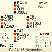 | Con | Dc | Res | Score | Ld | Pairs | Rd | Tbl | | 1 N | S | +1 | 120 | T | 01 - 06 | 3 | 1 |