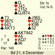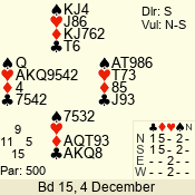 | Con | Dc | Res | Score | Ld | Pairs | Rd | Tbl | | 1 NT | N | = | 90 | 4 | 05 - 06 | 6 | 5 |