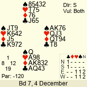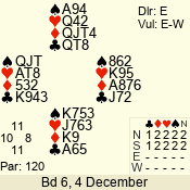 | Con | Dc | Res | Score | Ld | Pairs | Rd | Tbl | | 1 NT | N | +1 | 120 | T | 06 - 04 | 3 | 6 |