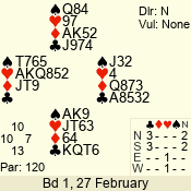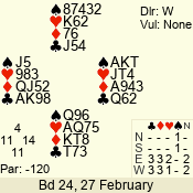 | Con | Dc | Res | Score | Ld | Pairs | Rd | Tbl | | 2 N | N | = | 120 | 2 | 04 - 01 | 4 | 4 |