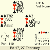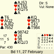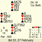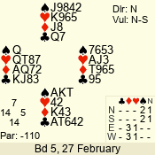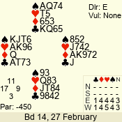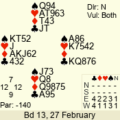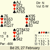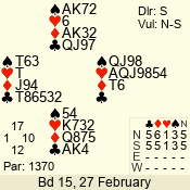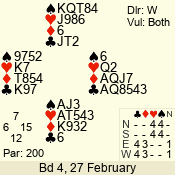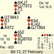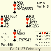 | Con | Dc | Res | Score | Ld | Pairs | Rd | Tbl | | 3 N | S | = | 400 | 6 | 01 - 05 | 2 | 1 |