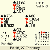 | Con | Dc | Res | Score | Ld | Pairs | Rd | Tbl | | 3 N | N | = | 600 | 5 | 02 - 05 | 3 | 2 |
