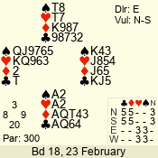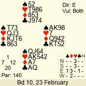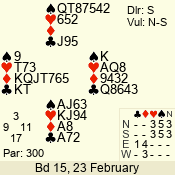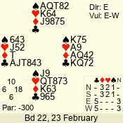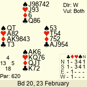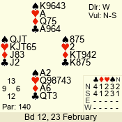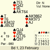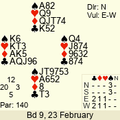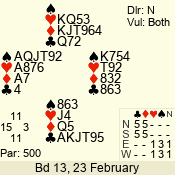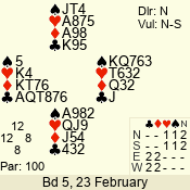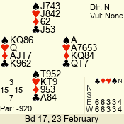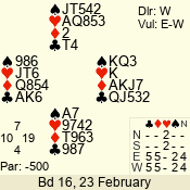 | Con | Dc | Res | Score | Ld | Pairs | Rd | Tbl | | 3 N | N | +3 | 490 | J | 05 - 02 | 1 | 2 |