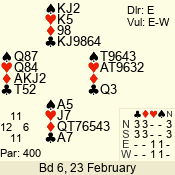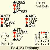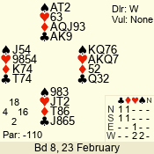 | Con | Dc | Res | Score | Ld | Pairs | Rd | Tbl | | 2 N | W | -4 | 400 | Q | 09 - 02 | 10 | 6 |