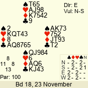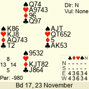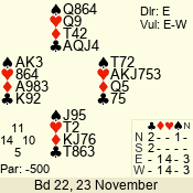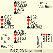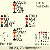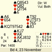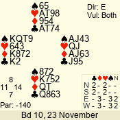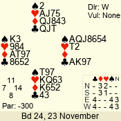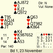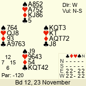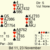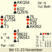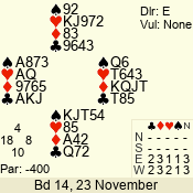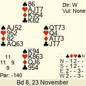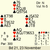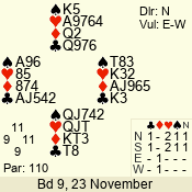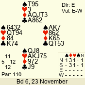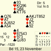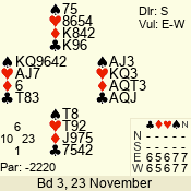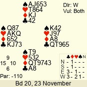 | 3 NT | W | +1 | -630 | 2 | 01 - 04 | 4 | 1 |