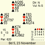 | 3 NT | S | +1 | 630 | K | 03 - 05 | 5 | 3 |