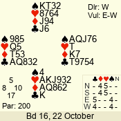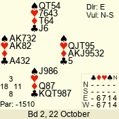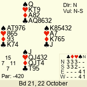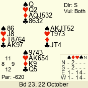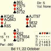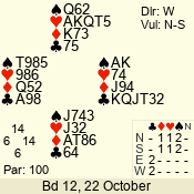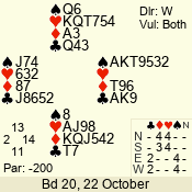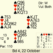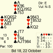 | Con | Dc | Res | Score | Ld | Pairs | Rd | Tbl | | 1 N | S | +2 | 150 | 4 | 03 - 06 | 4 | 3 |
