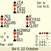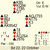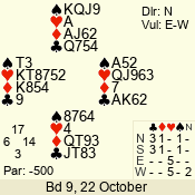 | Con | Dc | Res | Score | Ld | Pairs | Rd | Tbl | | 3 N | E | -1 | 50 | A | 02 - 05 | 4 | 2 |