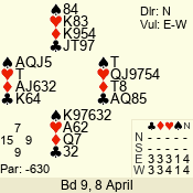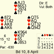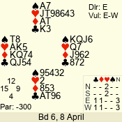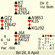 | Con | Dc | Res | Score | Ld | Pairs | Rd | Tbl | 4  | E | -4 | 400 | 2 | 06 - 09 | 12 | 6 |