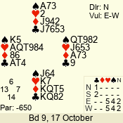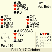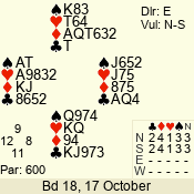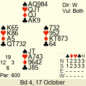 | Con | Dc | Res | Score | Ld | Pairs | Rd | Tbl | | 3 NT | N | = | 600 | 3 | 05 - 04 | 2 | 5 |
