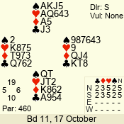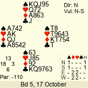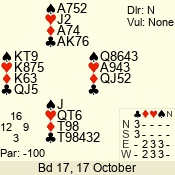 | Con | Dc | Res | Score | Ld | Pairs | Rd | Tbl | | 3 NT | N | +2 | 660 | 4 | 05 - 01 | 5 | 5 |