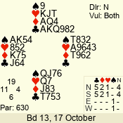 | Con | Dc | Res | Score | Ld | Pairs | Rd | Tbl | | 3 NT | N | +1 | 630 | 6 | 02 - 01 | 2 | 2 |