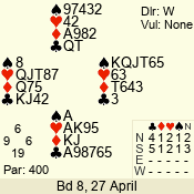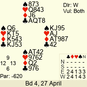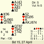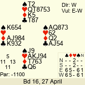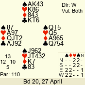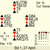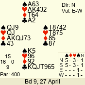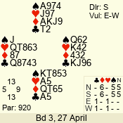 | Con | Dc | Res | Score | Ld | Pairs | Rd | Tbl | | 3 N | S | +1 | 430 | Q | 01 - 06 | 3 | 1 |
