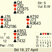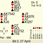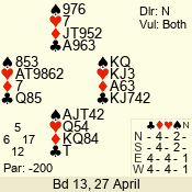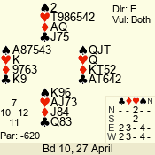 | Con | Dc | Res | Score | Ld | Pairs | Rd | Tbl | | 2 N | E | -4 | 400 | K | 02 - 06 | 4 | 2 |
