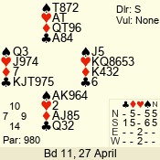 | Con | Dc | Res | Score | Ld | Pairs | Rd | Tbl | | 3 N | S | +3 | 690 | 2 | 02 - 07 | 3 | 2 |