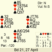 | Con | Dc | Res | Score | Ld | Pairs | Rd | Tbl | | 2 N | S | = | 120 | 2 | 03 - 05 | 6 | 3 |