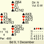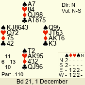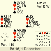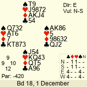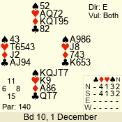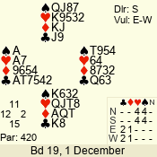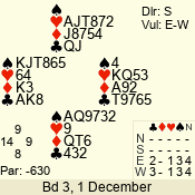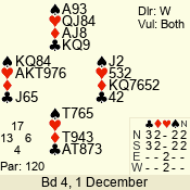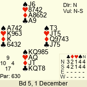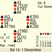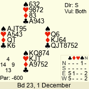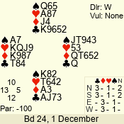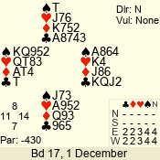 | Con | Dc | Res | Score | Ld | Pairs | Rd | Tbl | | 3 N | N | +1 | 430 | T | 06 - 04 | 3 | 6 |
