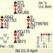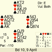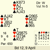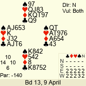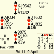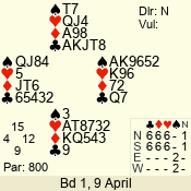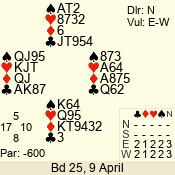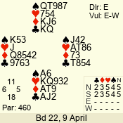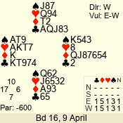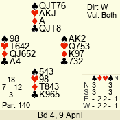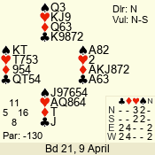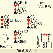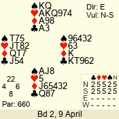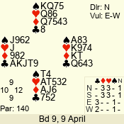 | Con | Dc | Res | Score | Ld | Pairs | Rd | Tbl | | 3 N | S | +2 | 660 | 5 | 05 - 13 | 10 | 5 |
