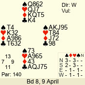 | Con | Dc | Res | Score | Ld | Pairs | Rd | Tbl | | 3 N | W | -2 | 200 | 6 | 02 - 08 | 12 | 2 |
