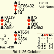 | Con | Dc | Res | Score | Ld | Pairs | Rd | Tbl | | 3 N | S | +1 | 430 | 9 | 03 - 04 | 7 | 3 |