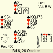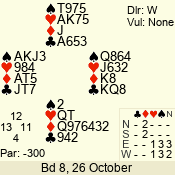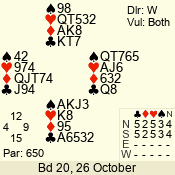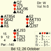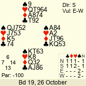 | Con | Dc | Res | Score | Ld | Pairs | Rd | Tbl | | 3 N | N | +2 | 660 | 6 | 05 - 03 | 3 | 5 |