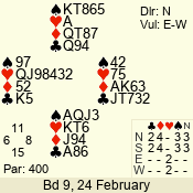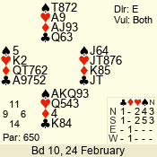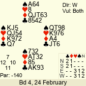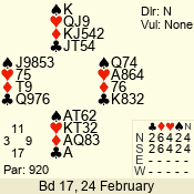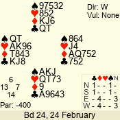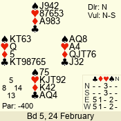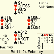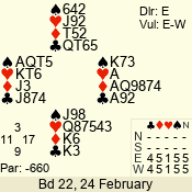| 3 NT | W | +2 | -660 | 5 | 10 - 17 | 13 | 10 |
