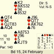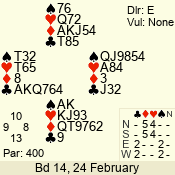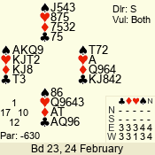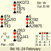 | 3 NT | W | +1 | -630 | 5 | 10 - 16 | 14 | 10 |