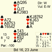 | Con | Dc | Res | Score | Ld | Pairs | Rd | Tbl | | 2 NT | W | -3 | 300 | J | 01 - 01 | 1 | 1 |