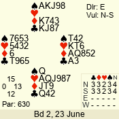 | Con | Dc | Res | Score | Ld | Pairs | Rd | Tbl | | 3 NT | N | +1 | 630 | A | 04 - 02 | 3 | 4 |