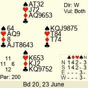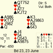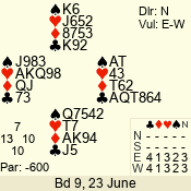 | Con | Dc | Res | Score | Ld | Pairs | Rd | Tbl | | 3 NT | N | = | 600 | 3 | 05 - 02 | 4 | 5 |