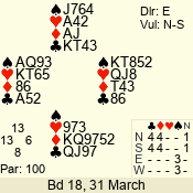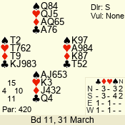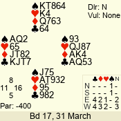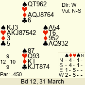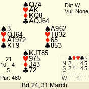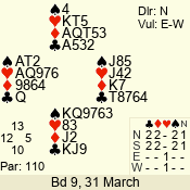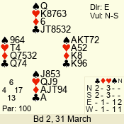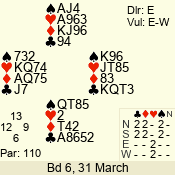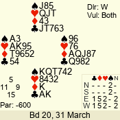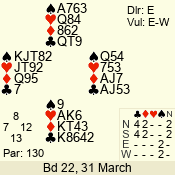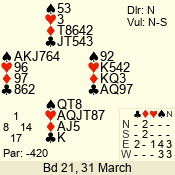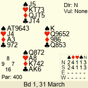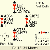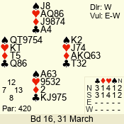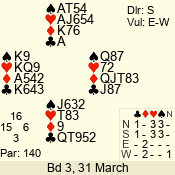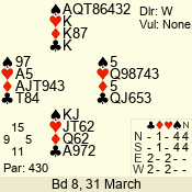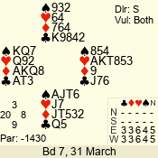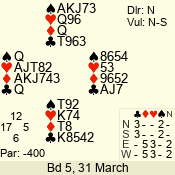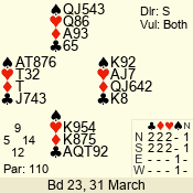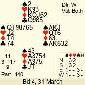 | Con | Dc | Res | Score | Ld | Pairs | Rd | Tbl | | 3 N | N | +1 | 430 | Q | 02 - 01 | 2 | 2 |