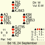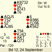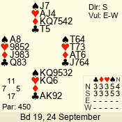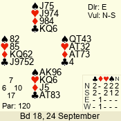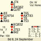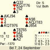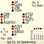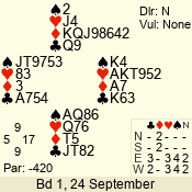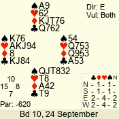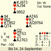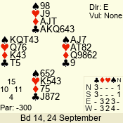 | Con | Dc | Res | Score | Ld | Pairs | Rd | Tbl | | 3 N | E | -1 | 100 | 6 | 04 - 05 | 8 | 4 |