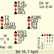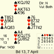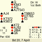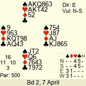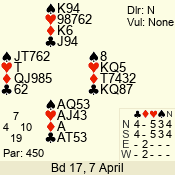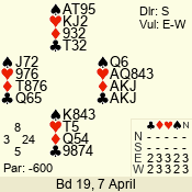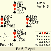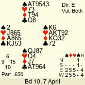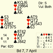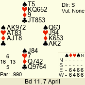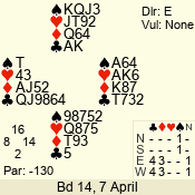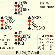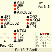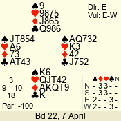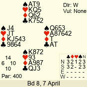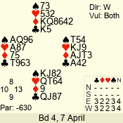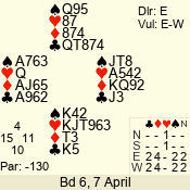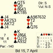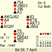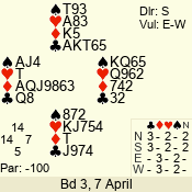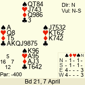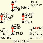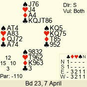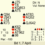 | Con | Dc | Res | Score | Ld | Pairs | Rd | Tbl | | 3 N | E | -4 | 400 | 7 | 07 - 04 | 4 | 7 |