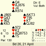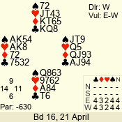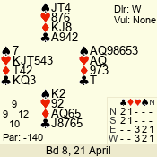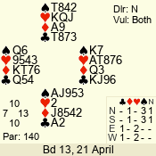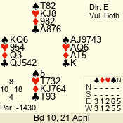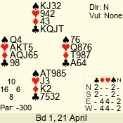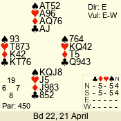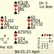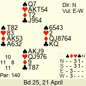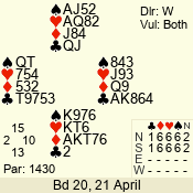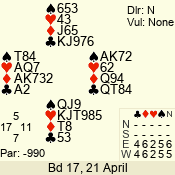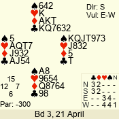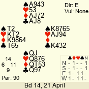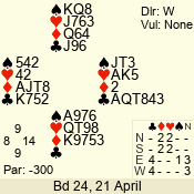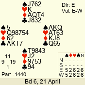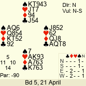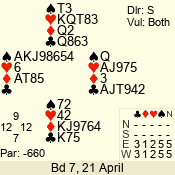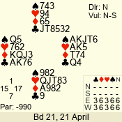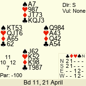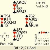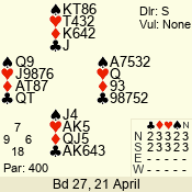 | Con | Dc | Res | Score | Ld | Pairs | Rd | Tbl | | 3 N | S | = | 400 | 7 | 05 - 04 | 6 | 4 |