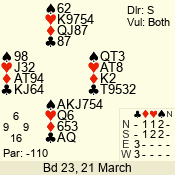 | Con | Dc | Res | Score | Ld | Pairs | Rd | Tbl | | 1 NT | S | +3 | 180 | Q | 01 - 06 | 2 | 1 |