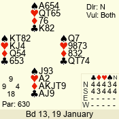| Con | Dc | Res | Score | Ld | Pairs | Rd | Tbl | | 3 N | S | +1 | 630 | 2 | 03 - 01 | 7 | 5 |