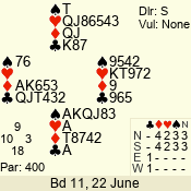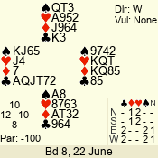 | Con | Dc | Res | Score | Ld | Pairs | Rd | Tbl | | 3 N | S | +2 | 460 | 3 | 04 - 05 | 6 | 4 |