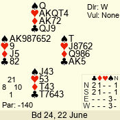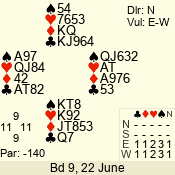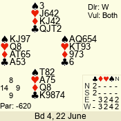 | Con | Dc | Res | Score | Ld | Pairs | Rd | Tbl | | 3 N | N | +2 | 660 | 2 | 04 - 05 | 6 | 4 |