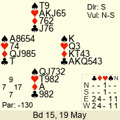 | Con | Dc | Res | Score | Ld | Pairs | Rd | Tbl | 3  | S | +1 | 130 | T | 01 - 04 | 3 | 1 |